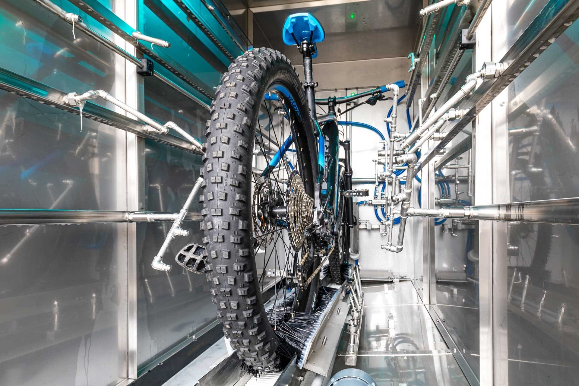 Zunächst wird das Bike mit verschiedenen, teils rotierenden Düsen, einer Vorwäsche unterzogen. Danach wird, je nach Waschprogramm, ein Reinigungsmittel aufgesprüht, das kurze Zeit einwirkt. Es folgt die Hauptwäsche, wieder mit den Düsen. Abschließend wird das Fahrrad mit klarem Wasser abgespült.